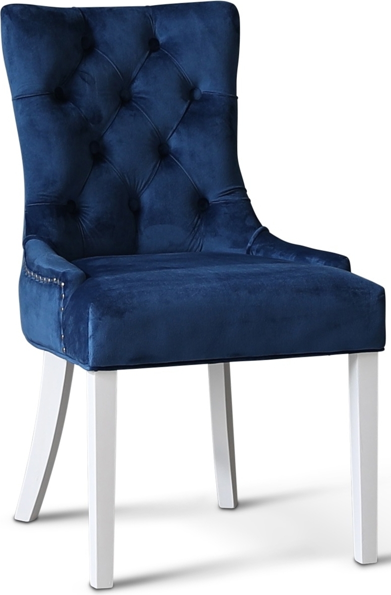 Dalsland matgrupp med runt matbord med toppskiva i oljad ek och vitlackat underrede. 4 st Tuva stolar i blå sammet.