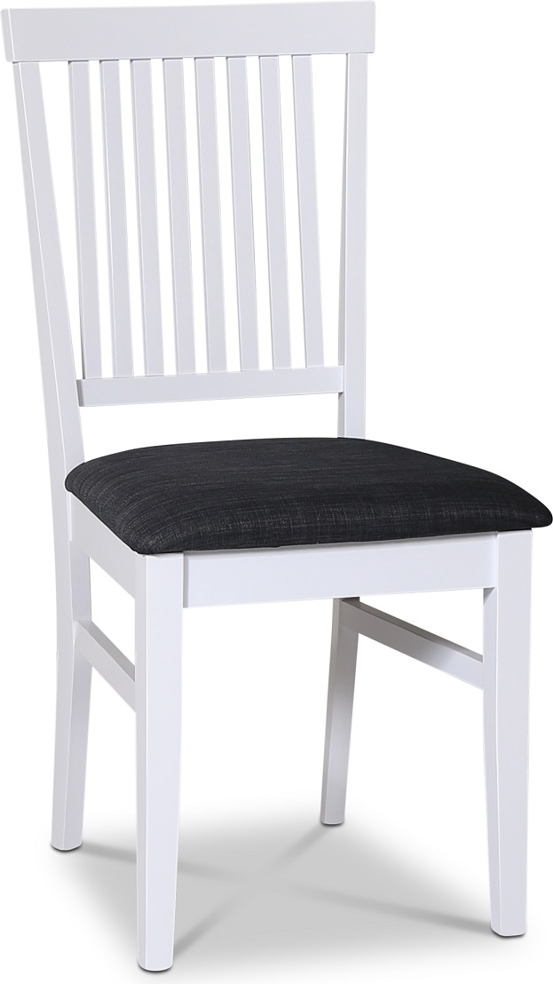 Fitchburg matgrupp från Skånska Möbelhuset, klassiskt runt matbord 106 cm i diameter, kan förlängas till ovalt bord 141 cm, med vitt underrede och en toppskiva i oljad ekfanèr. Det ingår 4 stycken matchande Fårö matstolar i vitlackat trä med sits i grått tyg.