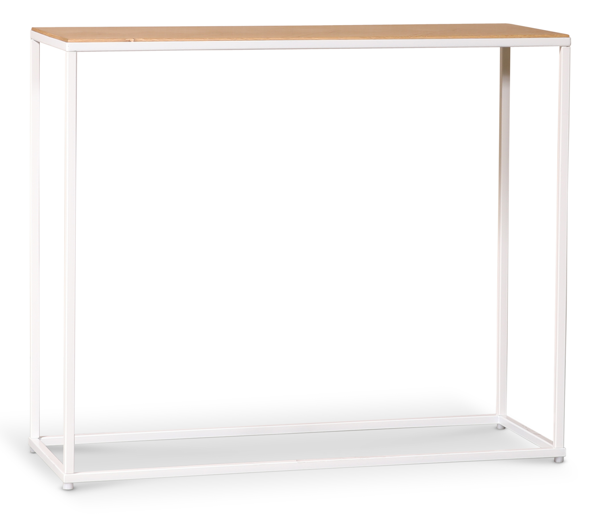 Stilrent konsolbord av vit metall med toppskiva av fiskbensmönstrad ekfanèr.
