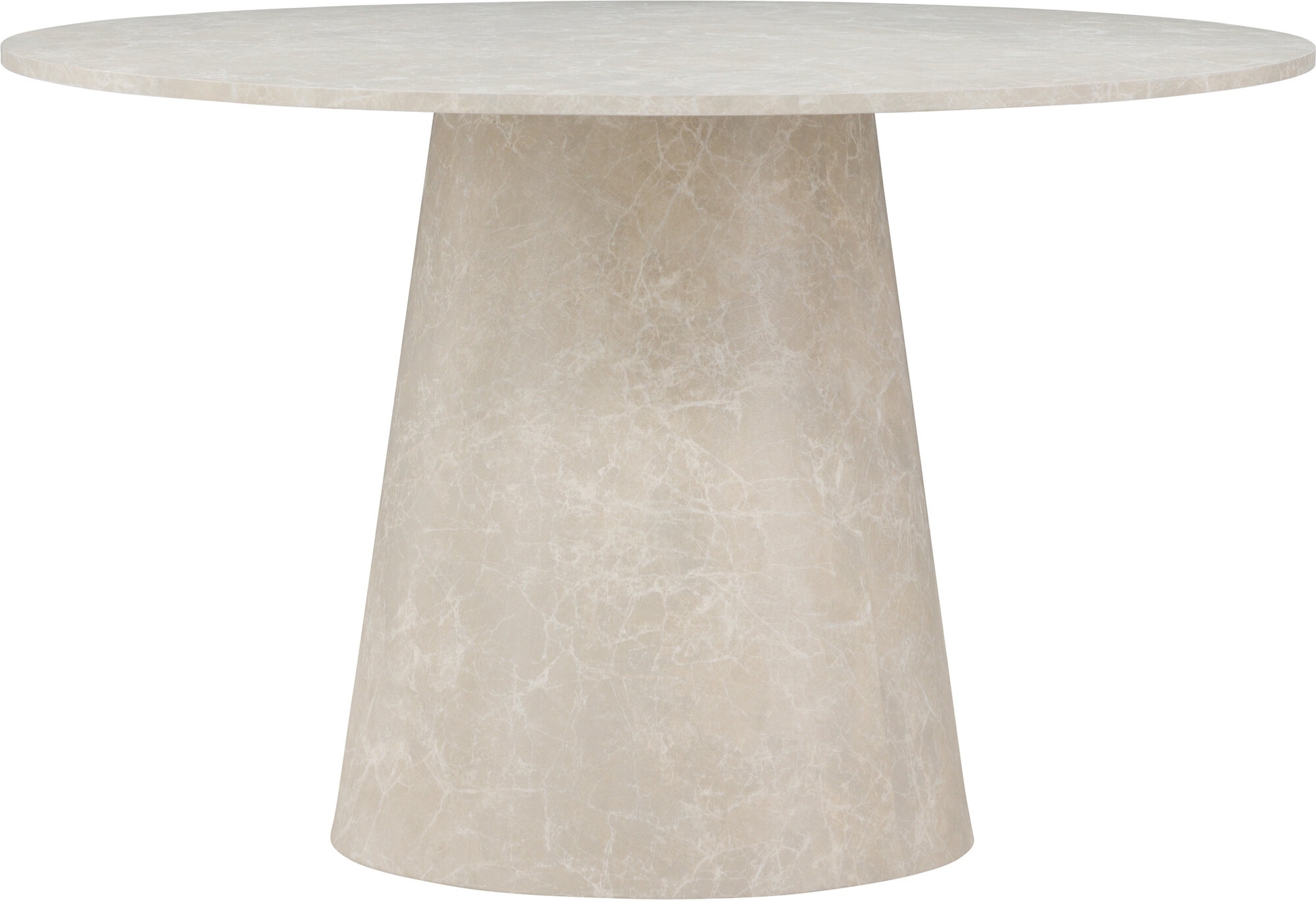 Lanzo matbord har en bordsskiva i beige marmorerad finish som efterliknar natursten och ger rummet en lyxig, harmonisk känsla. Den runda formen och den släta ytan gör bordet både praktiskt och lätt att hålla rent.