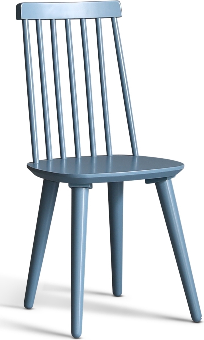 Dalsland matgrupp med runt matbord med toppskiva i oljad ek och vitlackat underrede. Dalsland pinnstolar i en läcker duvblå lack (RAL5007)