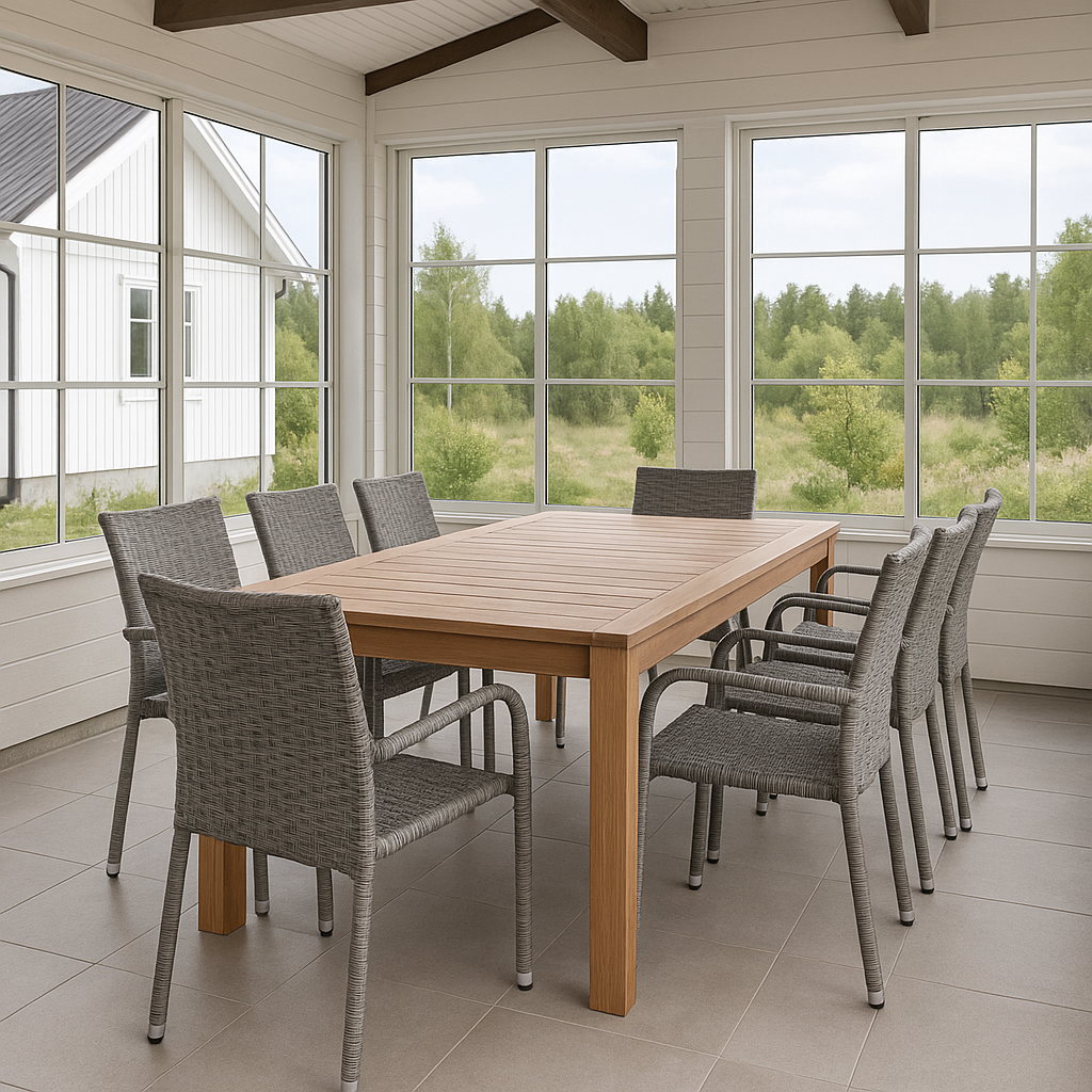 Här får du en stilren matgrupp med ett rejält teakbord och åtta praktiska stolar i grå konstrotting. Det generösa bordet ger gott om plats för middagar och umgänge utomhus, medan de nätta, stapelbara stolarna är lätta att placera runt bordet och smidiga att ställa undan vid behov. Bordet tillhör serien Saltö och stolarna modellen Ida, båda tillverkade för att hålla i utomhusmiljöer.