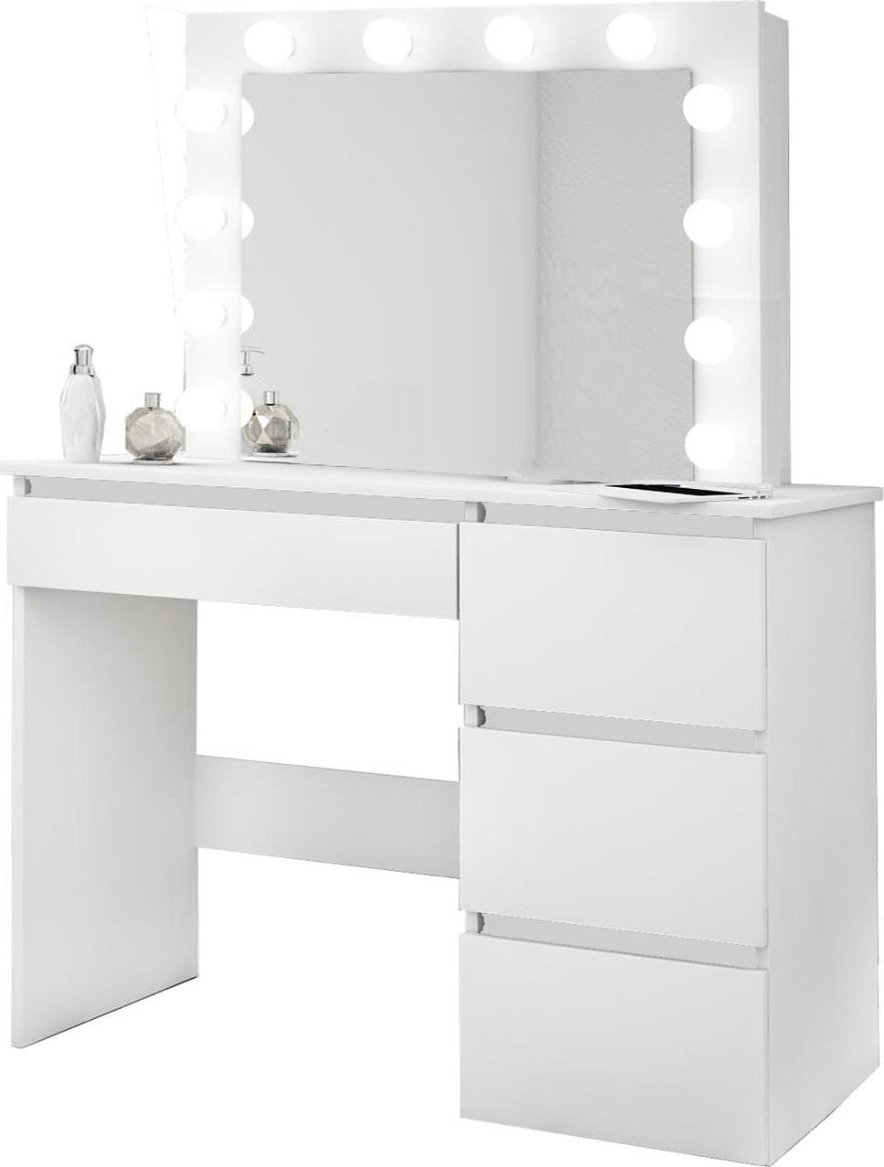 Sminkbord med LED-belysning och mycket förvaringsutrymme. Spegeln omges av 12 st LED-glödlampor.
