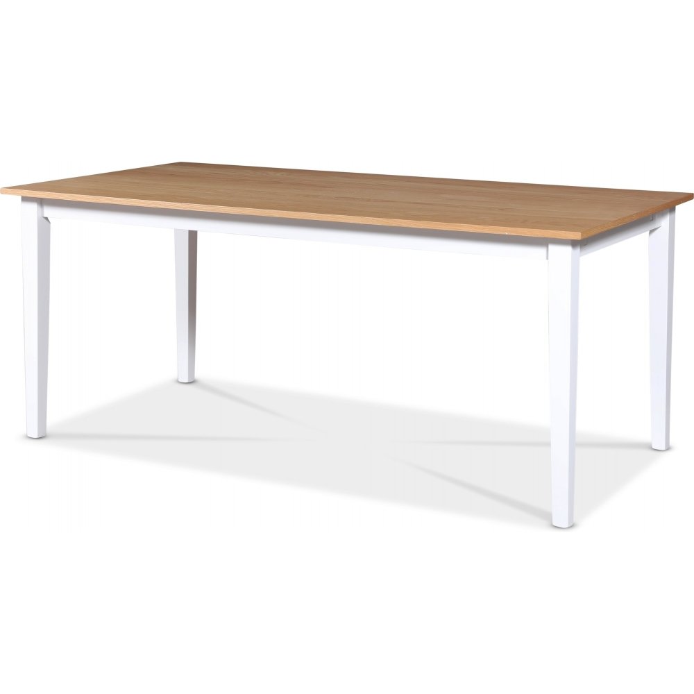 Fårö matgrupp från Skånska Möbelhuset, klassiskt matbord 180x90 cm med vitt underrede och en toppskiva i oljad ekfanèr. Det ingår 6 stycken matchande Karl pinnstolar i vitlackat trä.