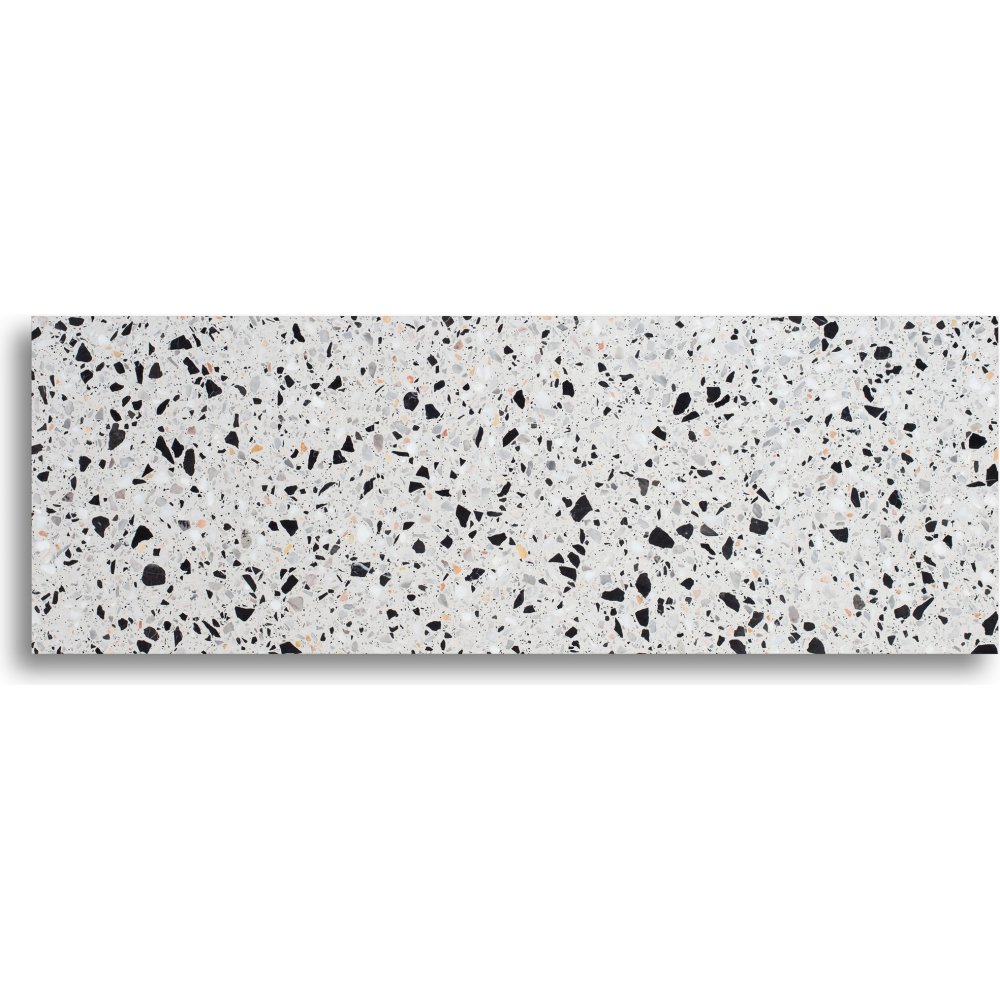 Terrazzo konsolbord med en cosmos terrazzo stenskiva (Ljus botten med svarta, bruna och grå stenar i) och AIR svart metallunderrede.