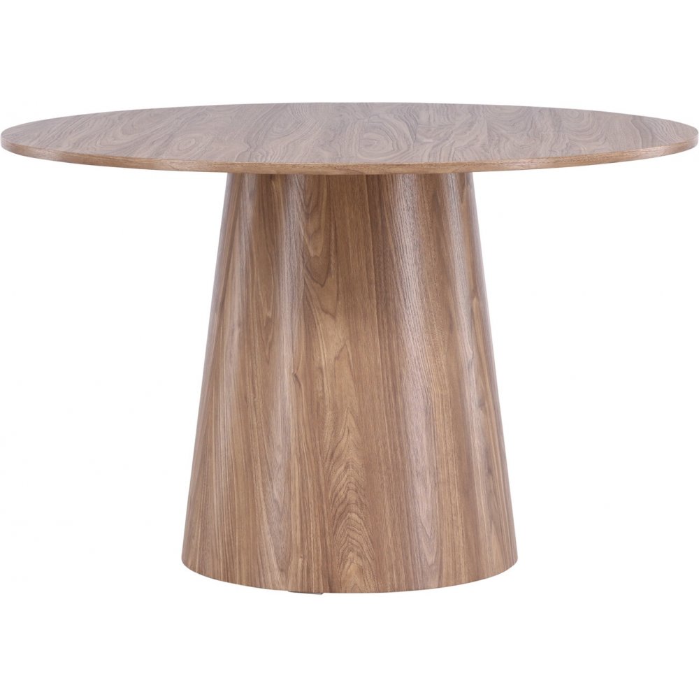 Matbord som imponerar med sin skandinaviska design och smakfulla utformning. Bordet är tillverkat i MDF och har en tunn, rund toppskiva tillsammans med en konformad stomme som är centrerad under bordets mitt. Den jordnära, valnötsliknande kulören framhäver materialets naturliga mönster och skapar ett levande uttryck med känsla av djup och rörelse. Ett stilrent blickfång för hemmets hjärta – här hamnar ingen på kanten.