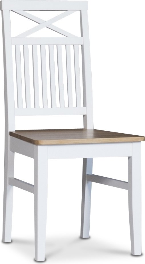 Stolarna är designade för att harmoniera med bordet – med vitmålad stomme och sits samt rygg i oljad ek. Ryggens kryssdesign fungerar både som ett stabilt ryggstöd och ett dekorativt inslag som förstärker gruppens klassiska uttryck. Konstruktionen är stabil och bekväm, vilket gör stolarna väl lämpade för daglig användning.
