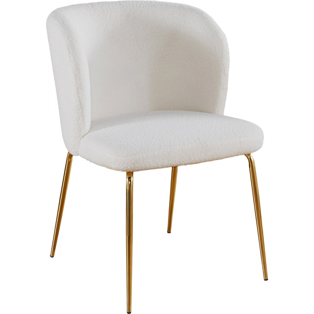 Stolarna är klädda i bouclètyg i färgen cream och har ett underrede i mässingsutförande. Kombinationen av träbord och textilklädda stolar ger en funktionell och stilren matplats för fyra personer.