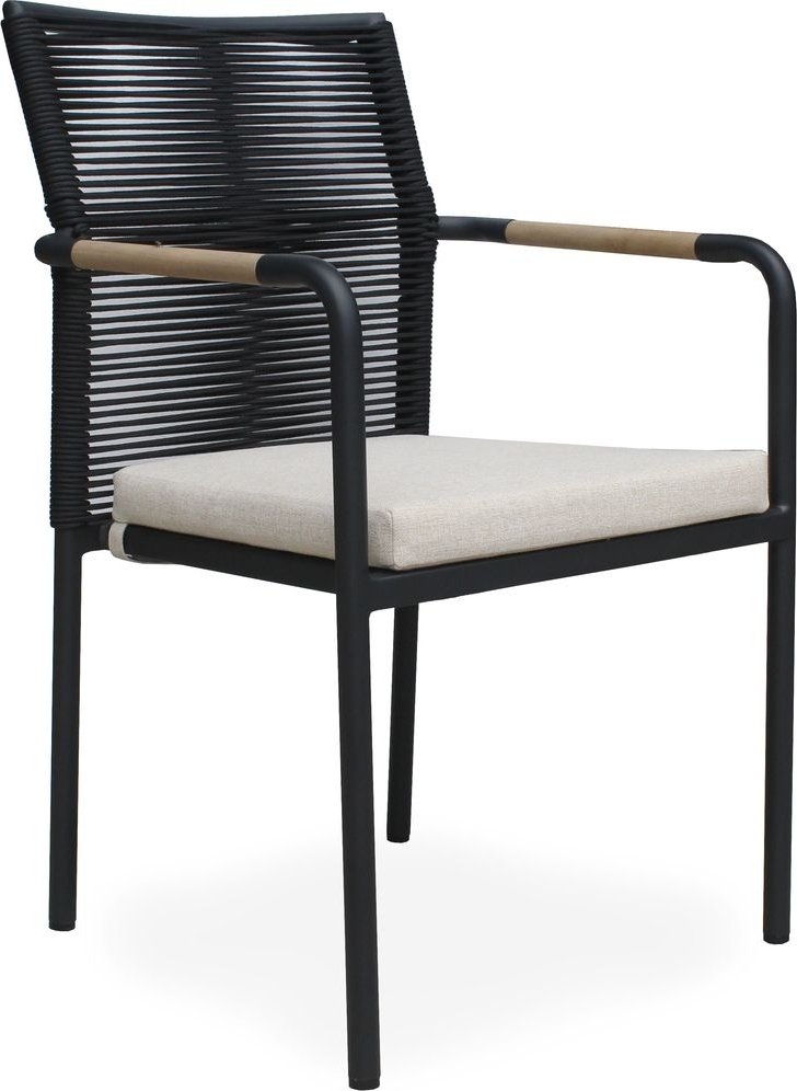Saltö matgrupp för uteplatsen med ett praktiskt slagbord i massiv teak, tillsammans med Skanör karmstolar med beige skön sittdyna och en svartlackad aluminiumstomme. En modern kombination på uteplatsen.